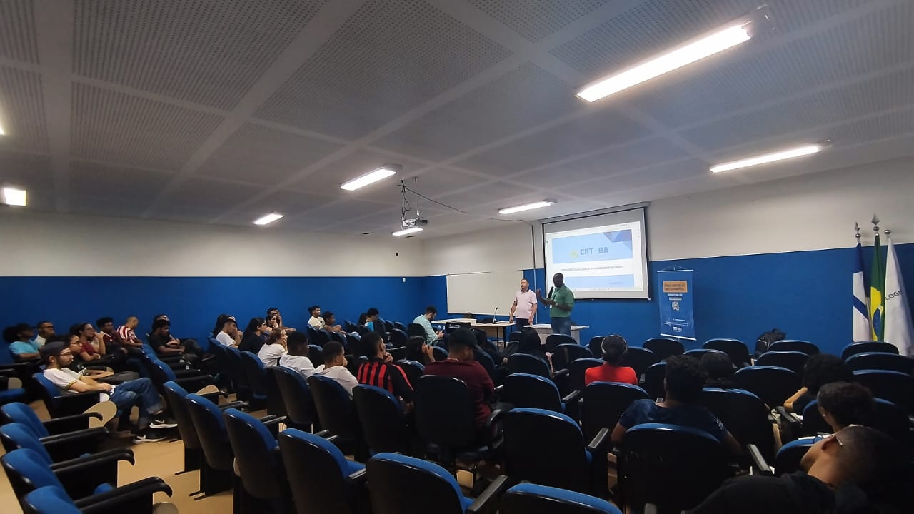 A palestra foi iniciada pelo Diretor de Fiscalização e Normas do CRT-BA, Saturnino do Nascimento, que explicou aos estudantes a importância do registro profissional para o exercício legal da profissão.
