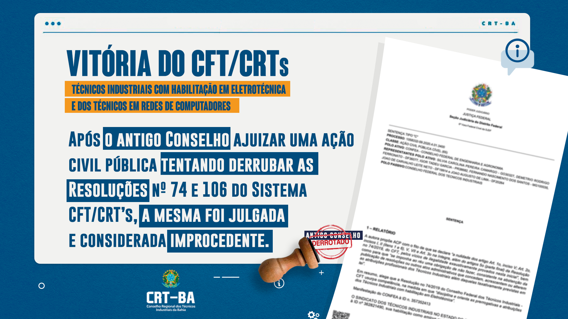 Após o antigo Conselho ajuizar uma ação civil pública tentando derrubar as Resoluções nº 74 e 106 do Sistema CFT/CRT’s, que dispõem sobre as atribuições dos técnicos em eletrotécnica e dos técnicos em redes de computadores, respectivamente, a ação foi julgada como improcedente. Após a criação do Conselho Federal dos Técnicos Industriais, através da lei nº 13.639/2018, o Sistema CFT/CRT’s…